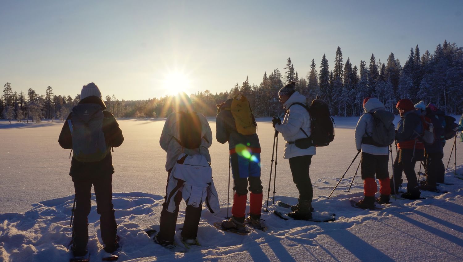 - Päivittäin lumikenkäillään n. 6 tuntia, sisältäen tauot.